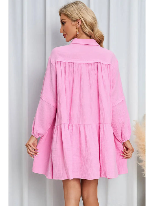 Pink Abstract Printed Lantern Sleeve Buttoned Mini Dress
