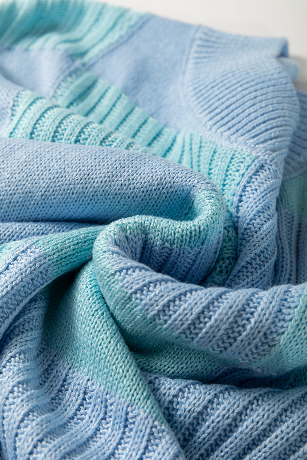 Light Blue Checkered Color Block Crew Neck Short Sleeve Sweater