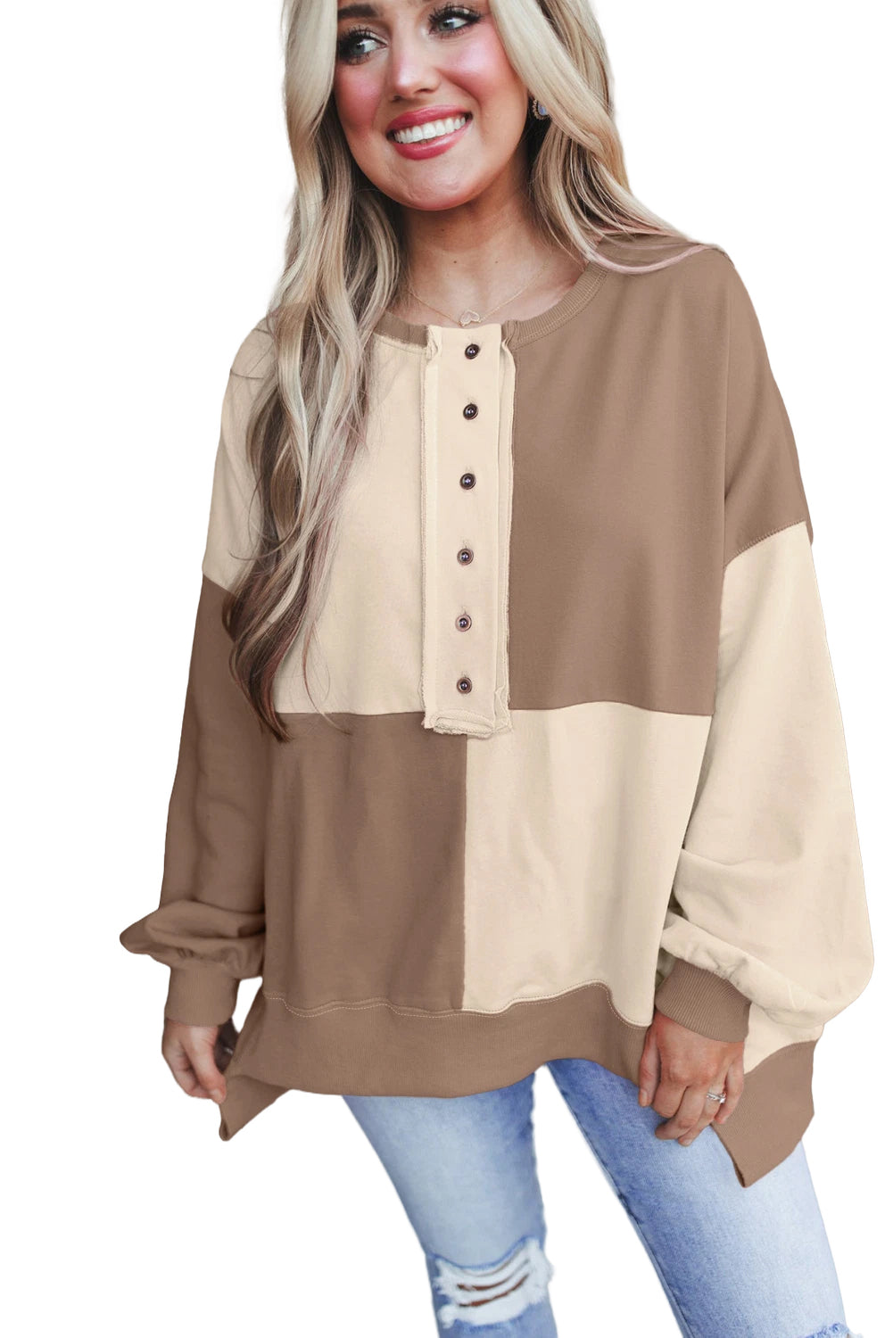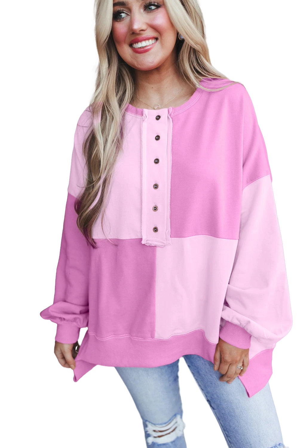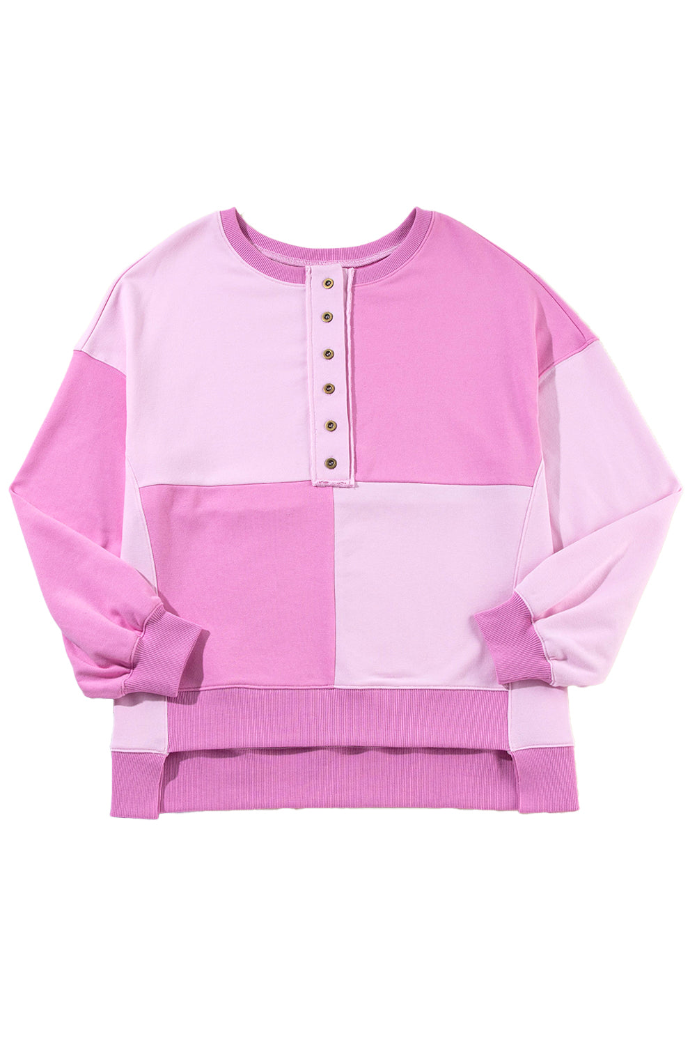 Pink Colorblock High Low Loose Henley Sweatshirt